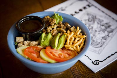 Garlic chicken, lettuce, tomato, cucumber, carrot, avocado, crunchy noodles and caramelized walnuts