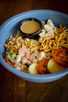 Chicken, shrimp, lettuce, veggies, peanuts and crunchy noodles. Served with Thai dressing.