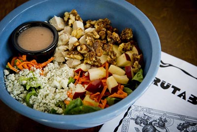 Chicken, spinach, apples, crumbled bleu cheese, caramelized walnuts, carrots and celery. Served with dijon vinaigrette.