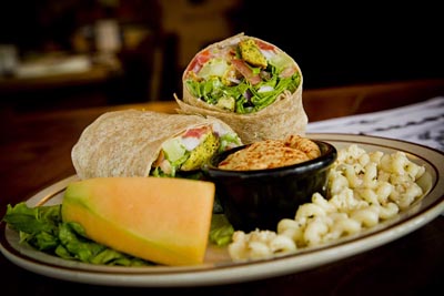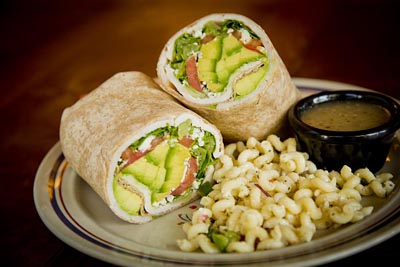 Turkey, avocado, lettuce, tomato and blue cheese crumbles. Served with Mediterranean dressing.