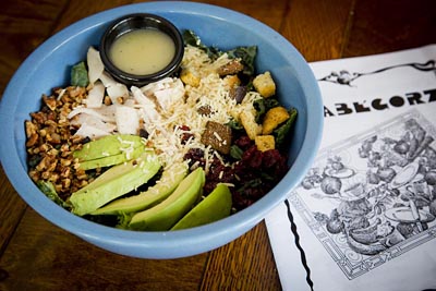Chicken, black beans, BBQ sauce, jack cheese, onion, cilantro, tomato, corn, and guacamole. Served with Southwestern Bleu Cheese dressing.